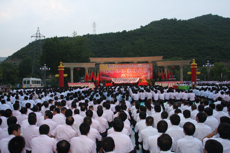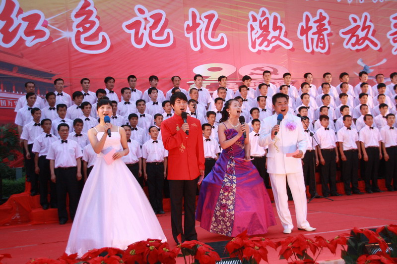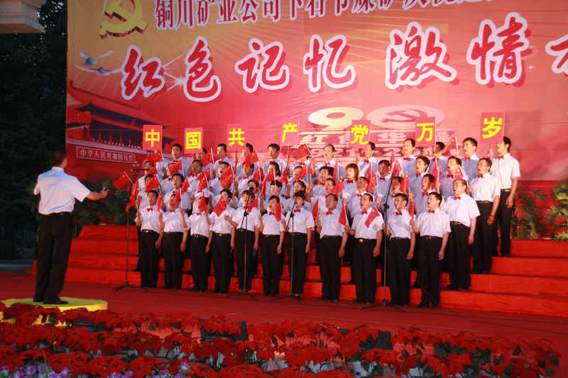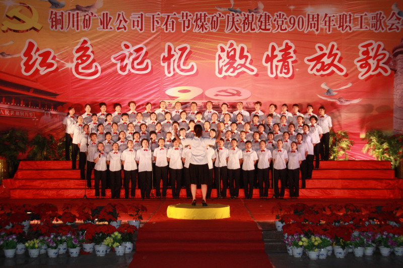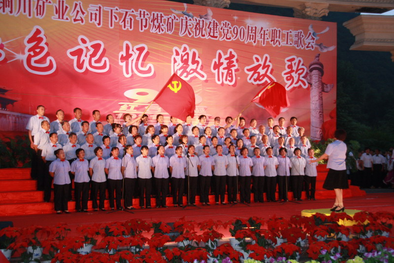 党啊,今天是您的生日,我们自豪,我们歌唱……7月1日晚,蛇山脚下的下石节矿欣怡广场歌声嘹亮,激情飞扬,该矿以职工红歌会的形式纪念建党90华诞。全矿21个单位1636人参加演出。舞台背景是在鲜红的党旗衬托下的“红色记忆、激情放歌”这8个醒目大字,熠熠生辉。鲜明的主题,表达出下石节人对党的无限忠诚与热爱。红歌会上,一首首激情澎湃、气势磅礡、豪情万丈的红色经典歌曲,再现历史风云,重述党的丰功伟绩。