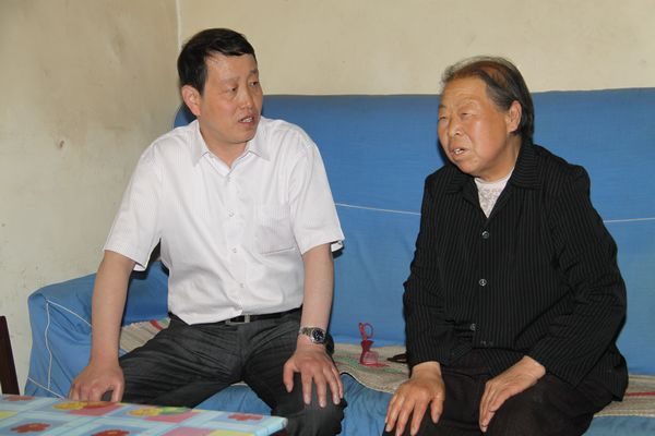 在庆祝建党90周年之际,鸭口煤矿党委书记兰阿利亲切家访了该矿已有56年党龄的老党员高秀英。