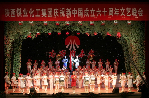 9月25日晚上,陕西煤业化工集团公司庆祝新中国成立60周年文艺晚会在铜川矿务局矿工俱乐部上演,集团公司所属单位职工用21个精彩节目尽情歌唱祖国,集团公司党委书记、董事长华炜、集团公司总经理高仰才、集团公司其他党政工团领导以及所属单位主要领导观看了演出。