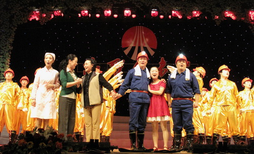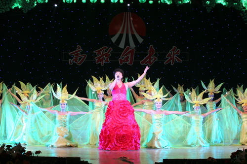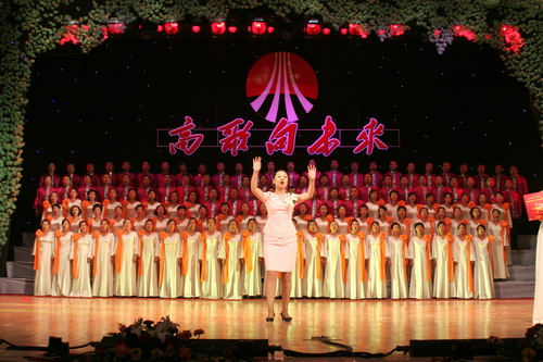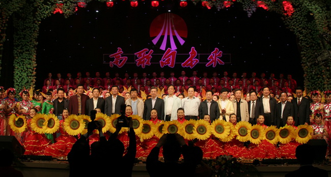 随后他宣布陕西煤业化工集团公司庆祝新中国成立60周年文艺晚会开始。激扬澎湃的国歌声随即响起,全体起立高歌。