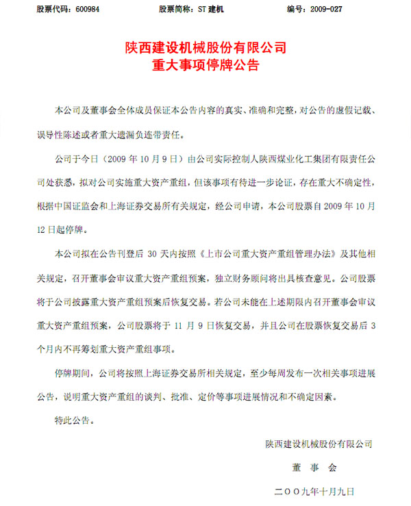 10月9日,陕西建设机械股份有限公司发布重大事项停牌公告,全文如下。