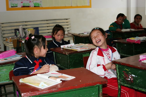 瞧!同学们在宽畅、明亮、舒适的教室里多高兴。