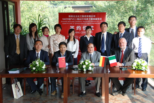 9月17日,在北京八达岭长城脚下,北元集团100万吨/年聚氯乙烯循环综合利用项目二期40万吨/年离子膜烧碱电解槽签字仪式隆重举行。陕西北元化工集团有限公司董事长李厚志、意大利伍德迪诺拉公司总裁舍文、中国天辰工程公司副总工程师杨克俭、中化建国际招标有限责任公司经理邵菲及相关人员参加了仪式。