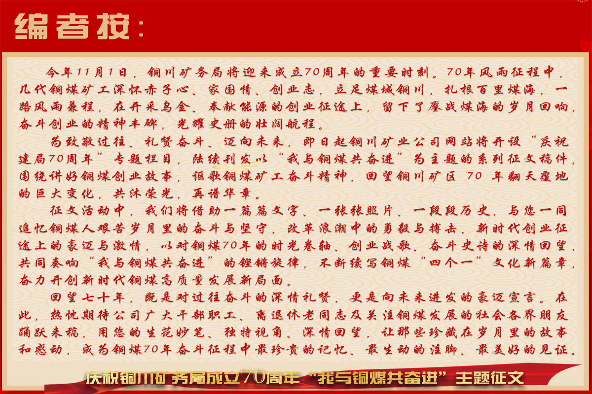 当时光的年轮行进到2025年,位于三秦大地、煤城铜川这方创业热土上的铜川矿业,也将迎来企业成立70周年的日子。在七秩春秋的奋斗中,几代铜煤矿工把“能源报国、服务社会”的初心汇成矿区的光影记忆,把“开采乌金、奉献光热”的誓言锻造成创业奋战的钢铁脊梁,以一曲巍然挺立于渭北黑腰带上的奋斗长歌,讲述着属于铜煤人的创业故事和动人史诗。