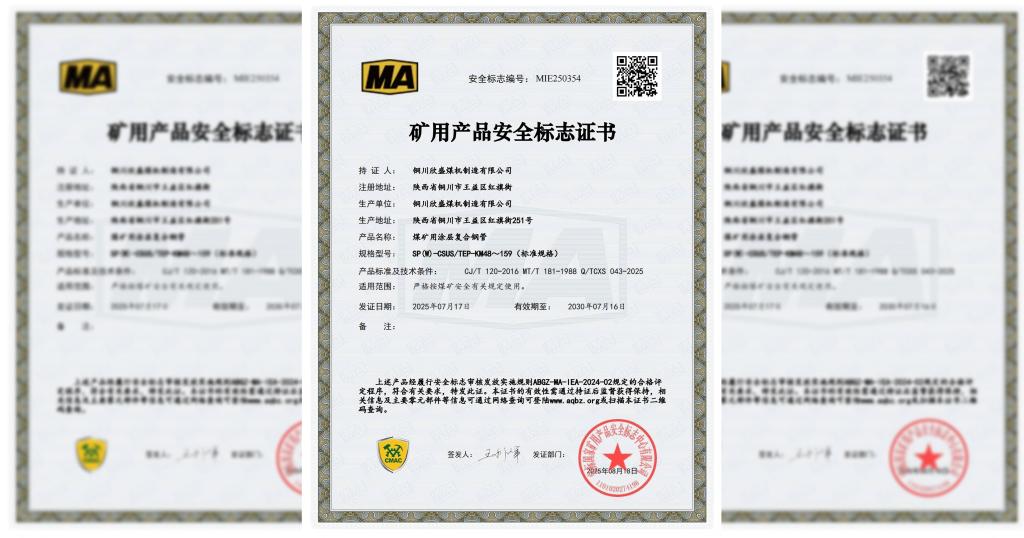 近日,铜川欣盛煤机制造有限公司顺利通过安标国家矿用产品安全标志中心监督评审,获得了“煤矿用涂层复合钢管矿用产品安全标志证书”,为提升企业市场竞争力再添砝码。