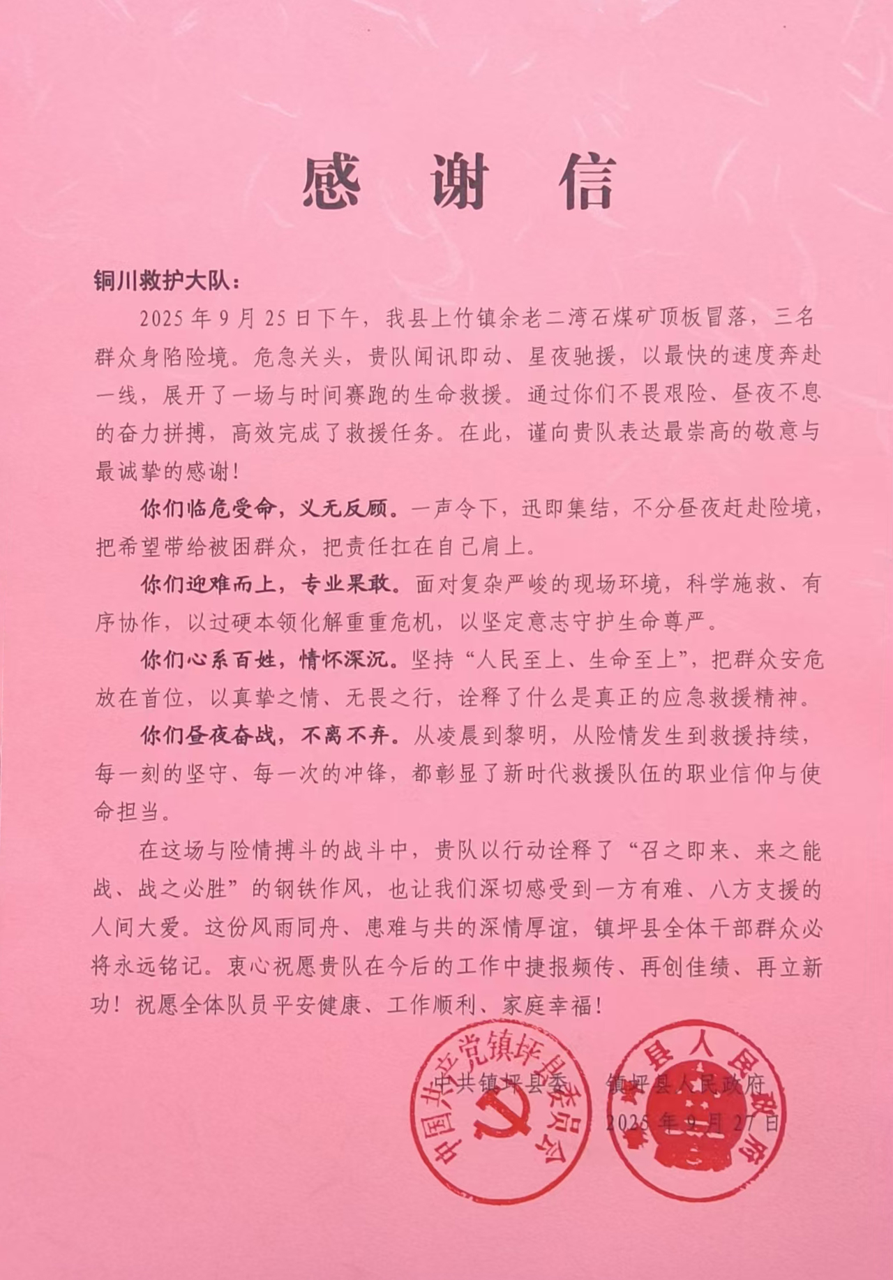 9月25日下午,陕西省安康市镇坪县余老二湾石煤矿井下检修作业区域发生顶板事故,3名人员被困,情况危急。接到紧急救援指令的公司救护大队迅速响应,火速集结队伍,一路风雨兼程奔赴事故现场。凭借多年的丰富经验、精湛的救援技术及高效协同作战能力,全力推进搜救工作,以实际行动赢得当地政府与群众的高度赞誉,并送来锦旗和感谢信,感谢公司救护大队不畏艰难,星夜驰援,高效完成了救援任务,以实际行动诠释了该队“召之即来、来之能战、战之必胜”的钢铁作风和责任担当。