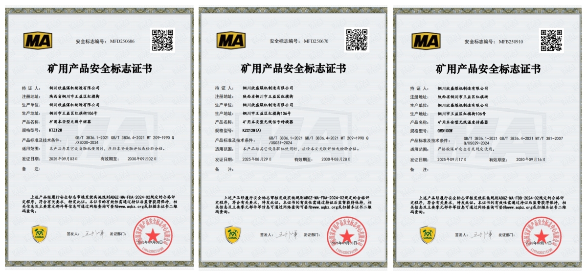 近日,铜川欣盛煤机公司合作研发的采空区无线火灾预警系统顺利通过国家矿用产品安全标志认证并颁发证书。该系统包含矿用本安型无线信号转换器、矿用本安型无线温度传感器和矿用本安型无线中继器共三款核心产品,标志着该技术已具备全面推广与井下应用条件,为煤矿企业采空区防灭火工作提供新的解决方案。