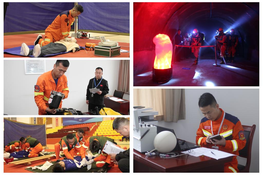 室外赛场竞技如火如荼,室内赛场的比拼也是精彩纷呈。争分夺秒的医疗急救环节,上演“与时间竞速”的紧张场景;在烟雾弥漫的模拟“事故”区域,向战而行的参赛队员,则临危不乱地进行着现场状况评估、伤员救治、灾区灭火、冒顶区支护、危险巷道侦查、封闭火区等一项项比拼;灾害气体分析竞赛现场,空气如凝滞一般,仿佛只能听见参赛队员的心跳和仪表数据变化的声响;呼吸器操作赛场,围绕参赛队员排查呼吸器隐患的准确性与故障修复的时效性,展开测评与考核。