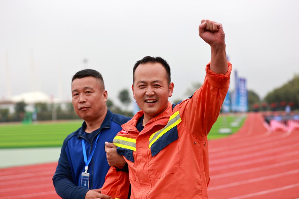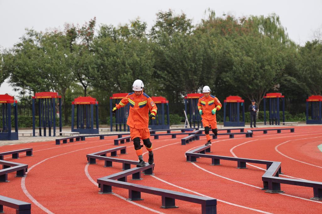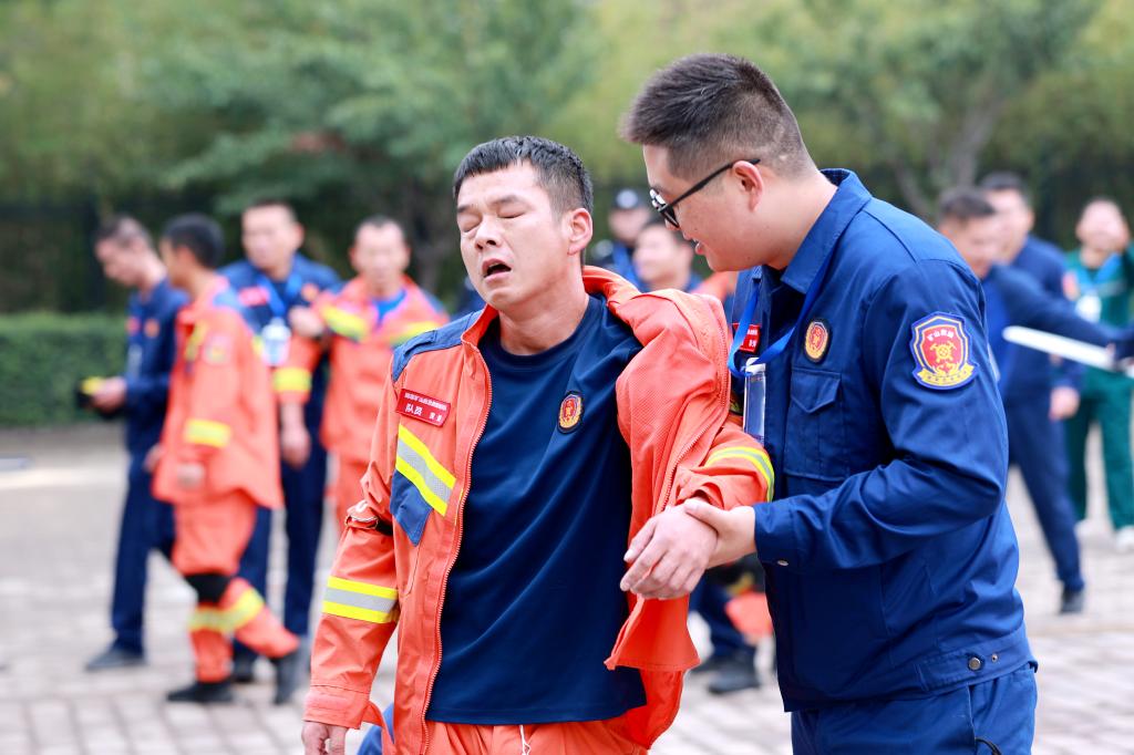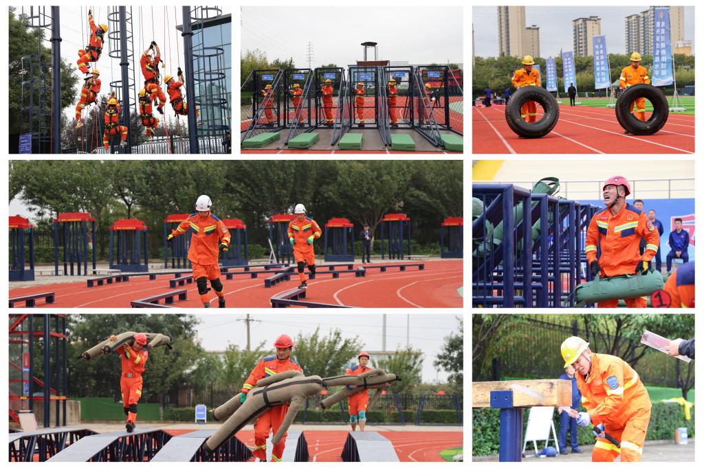 当日上午和接下来的两天,综合技能竞赛现场,高空攀绳、剪切破拆、匍匐过矮巷、蓄力翻轮胎、协调身姿过曲桥、扛着重物坡道运物料、连续作业抛重物、瞄准尺寸锯木料等一项项的竞技比拼不断上演,以上项目必须在8分钟之内,按要求时间完成,这些项目对参赛队员的体能、耐力是近乎接近“体能极限”的考验,项目超时将扣分,超过10分钟将被终止比赛。许多参赛队员完成项目时已是大汗淋漓,有的已疲惫不堪,需要近旁的人员搀扶着走向休息区域。