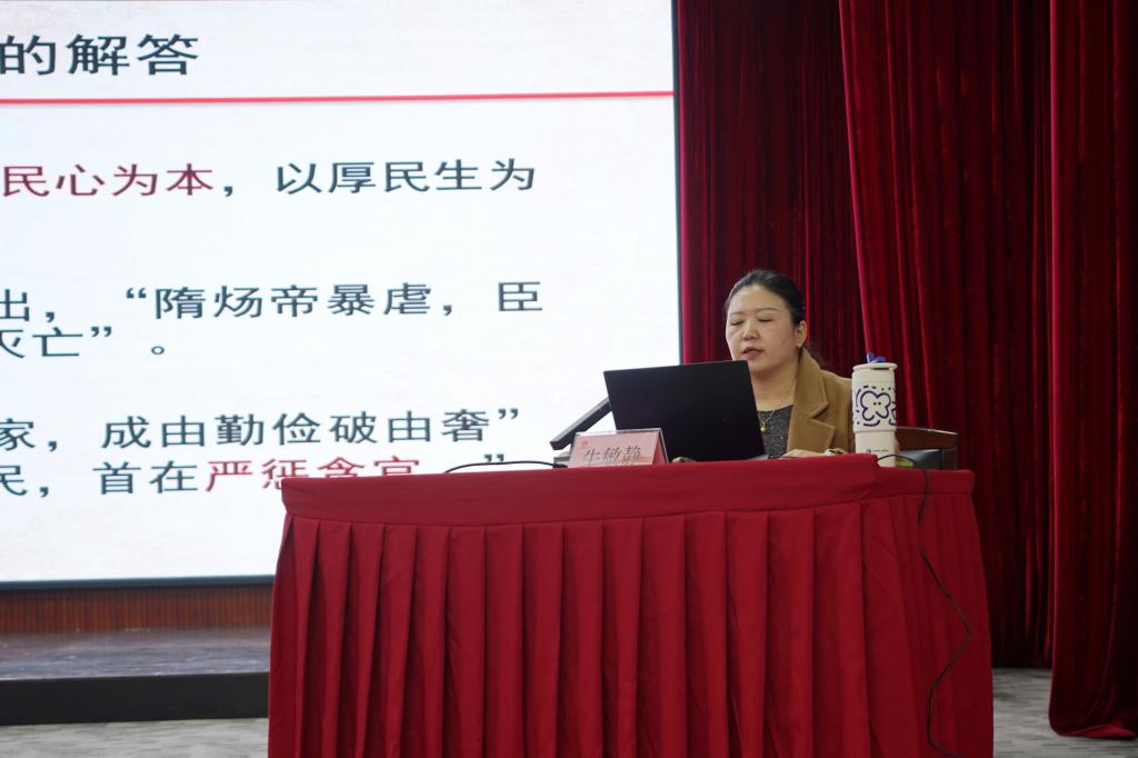 牛敏静教授向大家讲解了全面从严治党的重要性、加强党同廉政建设、推进党的自我革命、加强党的领导、增强党的创造力、加强党员干部教育培训、加强党的社会基础工作等方面对如何坚定不移推进党的自我革命进行了注解。通过解读,深刻阐明了全面从严治党、推进党的自我革命是新时代中国共产党的重要任务,也是实现中华民族伟大复兴的关键所在。只有坚持全面从严治党和自我革命的要求,才能保证我们党永远走在时代前列,促进党和国家事业的长远发展。