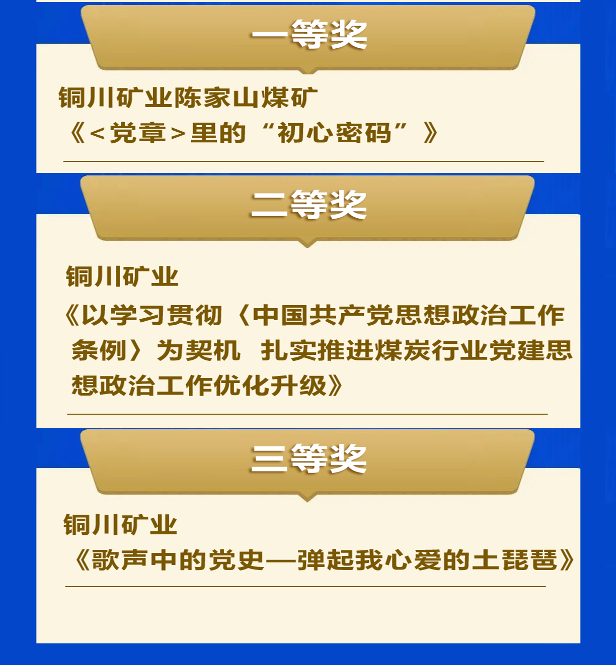 玉华煤矿玉华井作品《以学习贯彻〈中国共产党思想政治工作条例〉为契机,扎实推进煤炭行业党建思想政治工作优化升级》获二等奖。该作品立足行业发展大局,结合学习贯彻《中国共产党思想政治工作条例》,系统阐述了如何以制度建设为引领,探索党建思政工作提质增效的实践路径,推动煤炭行业党建思想政治工作不断迈上新台阶。