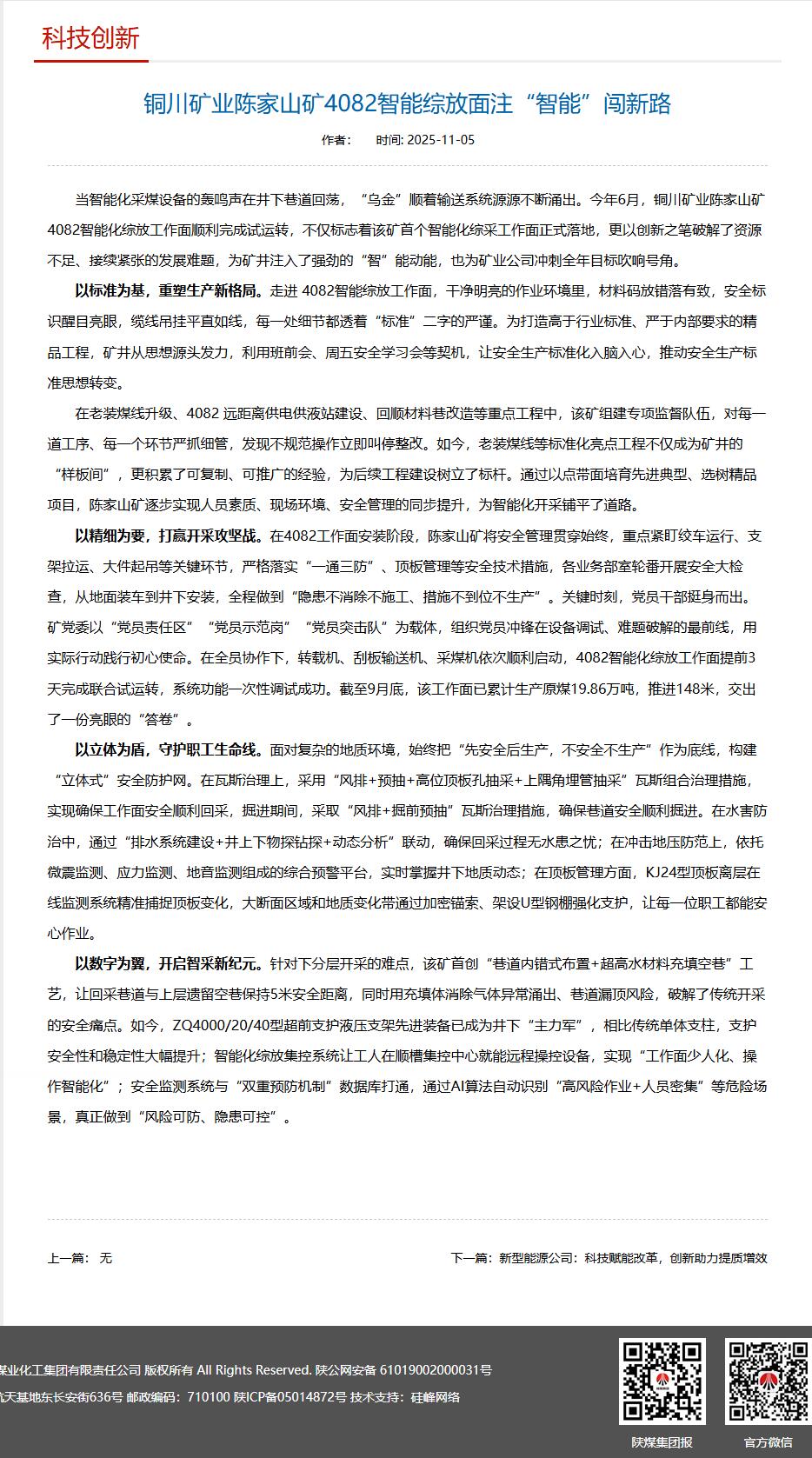 集团网| 铜川矿业陈家山矿4082智能综放面注“智能”闯新路
