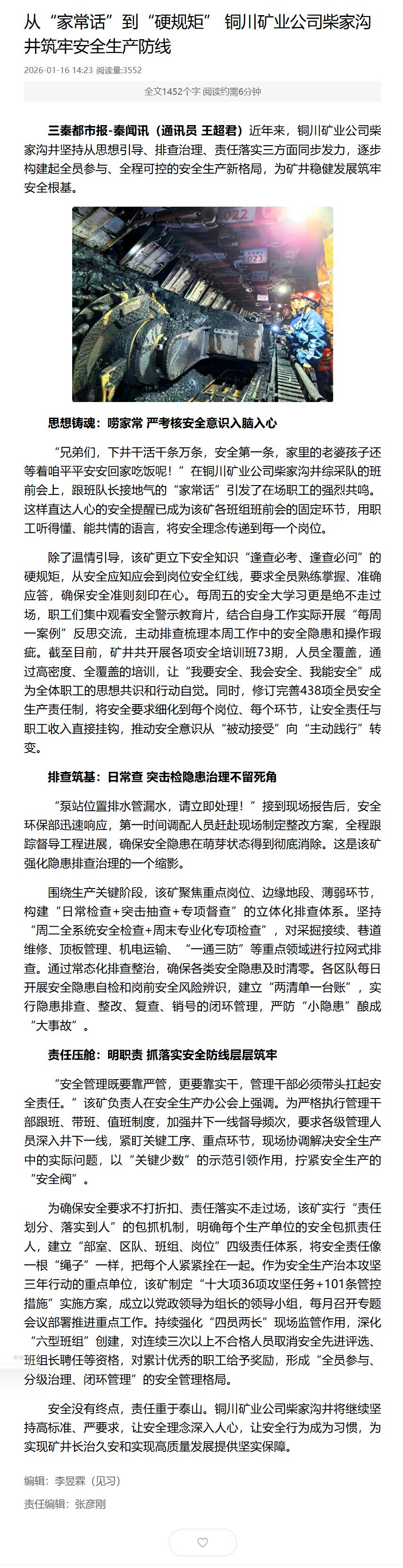 三秦网| 从“家常话”到“硬规矩” 铜川矿业公司柴家沟井筑牢安全生产防线