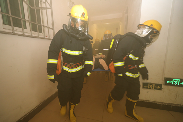 随着橙色烟雾升起,模拟火场逃生演练正式启动。参演人员严格遵循预定疏散路线,用湿毛巾捂住口鼻,低姿、快速、有序地从单身楼撤离。演练还设置了“伤员救援”情景,专业人员现场演示了担架转运与基础急救流程,进一步增强了大家在突发事件中的协作与救助能力。整个演练过程组织有序、贴近实战,既是一堂生动的安全教育课,也是落实安全生产责任的生动实践。
