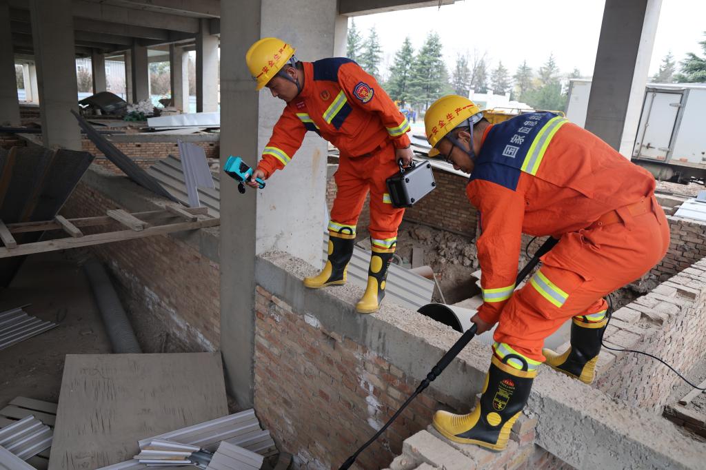抵达现场后,救援人员迅速搭建帐篷,成立现场指挥部。探查搜救组第一时间冲入废墟,利用热成像仪对废墟进行全域扫描,蛇眼探测仪深入缝隙,精准定位“被困人员”,一人深陷坍塌基坑,被垮塌构件埋压,另一人困于倒塌楼层的上方平台,无法自行脱身。
