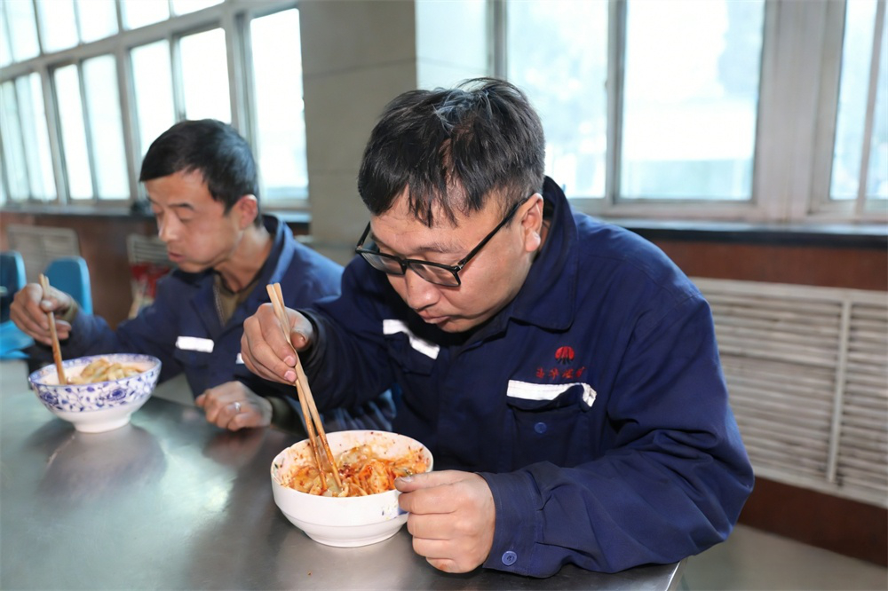 “零点班”的职工陆续走进餐厅,一碗碗刚出锅的水饺端上餐桌。四大机械巡检电工马小明夹起一个韭菜鸡蛋馅饺子,咬下一口后连连称赞“这饺子和家里包的一样香,皮薄馅大,吃完浑身都暖和了” 年轻的小李则选了“冬至套餐”蒸碗、鸡腿、拌莲菜,再搭配蛋花汤,让他称赞“营养又美味”。