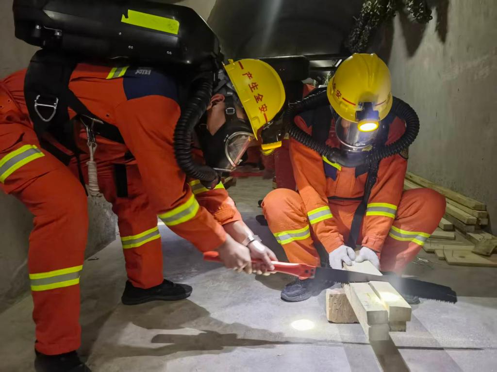 攀绳、翻轮胎、坡道运送物料、抛重物、锯木料等一系列连续体能项目不断考验着队员耐力;低温环境下氧气呼吸器安装校验等仪器操作精准完成,确保每一个步骤都准确无误;模拟巷道中队员们默契配合,完成环境探查、遇险人员搜救、现场标注等任务;医疗急救科目中,队员们熟练运用心肺复苏、创伤包扎等技能,快速处置模拟伤情,用专业素养为生命保驾护航。