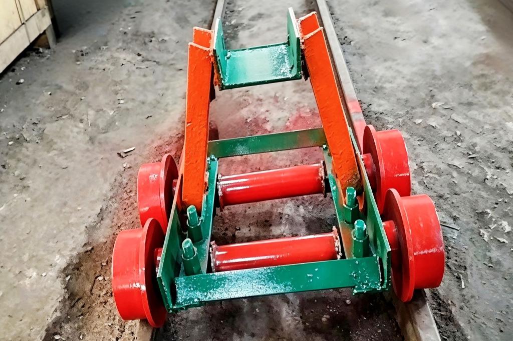 为解决快速、安全地将脱轨车辆拖离现场难题,该矿运输区职工主动开展技术攻关,立足岗位实践,成功研制出“底卸式矿车可移动应急拖车装置”。该装置设计巧妙、制作简易,利用备用轮组作为核心部件,通过合理适配连接机构,使其能够快速固定在脱轨矿车上。操作时,只需将装置与故障车辆可靠连接,即可迅速将脱轨车辆拖移至安全地带,整个过程中无需复杂的人工作业。