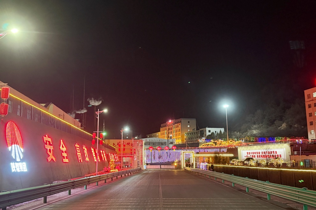 夜幕降临,一盏盏、一串串、一簇簇缤纷的彩灯,将矿区披上炫彩霓裳,矿内建筑在流光溢彩的灯光中熠熠生辉,草木也被点缀得格外亮丽,呈现出一派温馨、祥和的喜庆气氛。上下班途中的职工穿行其间,看灯火璀璨,感暖意融融,脸上满是幸福笑意。