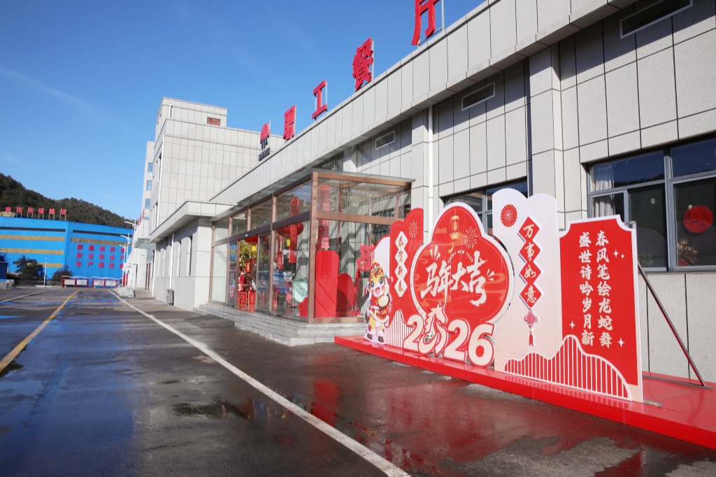 主干道上,大红灯笼沿灯杆整齐悬挂,在阳光映照下格外喜庆醒目。1号公寓楼前,“凝心聚力谱新篇 游园喜乐贺新春”的拱门大气庄重;职工餐厅门口,马年卡通造型生动可爱,玻璃门内新春装饰错落有致,“马年大吉”的温馨布置,让职工处处感受到家的温暖。