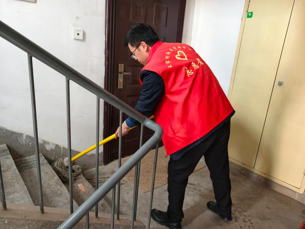 整治现场,党员志愿者们身着志愿服装,分工明确、干劲十足。大家手持拖把、扫帚、垃圾夹等工具,对小区各楼栋楼道进行全面清扫拖洗,仔细擦拭扶手、清理地面污渍;针对楼道内堆放的旧家具、纸箱、杂物等安全隐患,志愿者们耐心与居民沟通劝导,动手搬运清理,彻底疏通楼道消防通道,消除火灾、通行等安全风险。