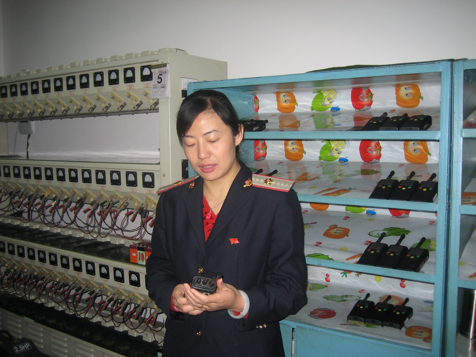 图为充电工正在调试对讲机等行车用品