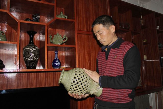 老戚是那种对任何事不做则已,既然做就必会尽最大努力做好的人。以前住的平房院子里有十余棵葡萄树,成熟后吃不完的他会自酿葡萄酒;现在住的单元楼,进门左侧墙上挂的一幅“上善若水”行书出自他手,正对门一组放置藏品的柜子系他设计;2012年正月十五矿上举办灯展,他代表所在区队自行构思、绘图,用了整整一周的业余时间,设计制作出两个高1.6米、宽0.8米,六面体、分三层,角边加飞龙、龙口吊彩带的仿古灯笼。